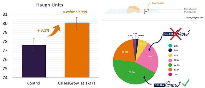 Another important parameter related to egg quality and freshness is the Haugh Unit. It measures the thickness of the albumen (egg white) which is rich in proteins. With CalseaGrow supplementation, Haugh unit is significantly increased by 3.1% allowing to attend a higher egg classification quality at 78 weeks old (cf. Figure 2).