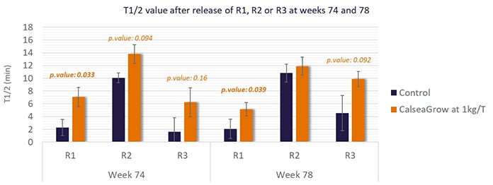 CalseaGrow increases the half-hemolysis time (T1/2), mainly in the form of reserves R1 and R3 in the laying hen (cf. Graphic 1). It means a better resistance to oxidation and can be explained by the capacity of CalseaGrow to provide natural antioxidants that are stored in laying hen cells.