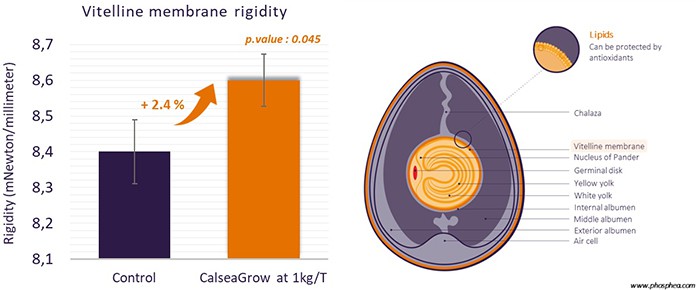 During oxidative stress, free radicals are responsible of cell damages such as lipid peroxidation and proteins oxidation. The vitelline membrane, composed of lipids, is one of the essential parameters related to egg quality and embryo development (cf. Figure 1). CalseaGrow demonstrates a significative improvement of this membrane rigidity by 2.4% at 78 weeks old (cf. Graphic 2). It means a better resistance to breakage which is useful for breaking factories (egg white / egg yolk separation) and hatcheries (ensures good white / yellow separation, which facilitates the development of embryo and thus increases the hatching rate).