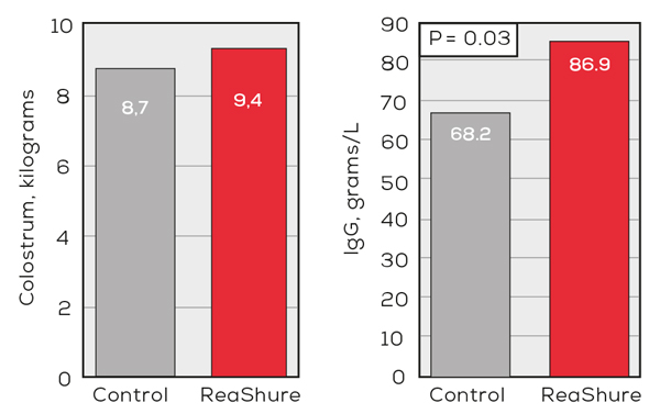 Colostrum volumes were statistically the same (8,7 vs. 9,4 kg for the control and ReaShure fed cows, respectively). However, the ReaShure fed cows produced significantly (P = 0.03) more Immunoglobulin G per liter of colostrum (68.2 vs. 86.9 g/L, Figure 2). This could have practical implications for calf health.