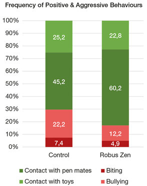 To mitigate aggressive behavior and improve profitability, Techna developed Robus Zen, a natural solution based on plant extracts and aromatic compounds. Robus Zen composition exerts calming effects by modulating neurotransmitters. It also supports digestive, antioxidant, and immune functions, thereby reducing the negative impact of aggressive behavior on performance. Field trials demonstrated that pigs receiving Robus Zen at 1 kg/t showed reduced physical activity throughout the finishing period and 42% fewer aggressive behaviors (such as tail and ear biting). Mortality and culling due to severe lesions or digestive disorders were also reduced.