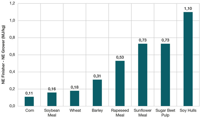 This equation is based on improved nutrient digestibility—particularly of fibers and amino acids—as pigs grow. Recent studies have demonstrated a 2.6% increase in energy digestibility between pigs weighing 35 kg and 75 kg, attributed to better utilization of fibers (NDF, hemicellulose, cellulose) and nitrogen. This allows for a more accurate description of the energy value of raw materials according to fiber content and pig weight. The difference between growth (7–75 kg) and finishing (75–130 kg) net energy values depend on the nutritional characteristics of raw materials—whether rich in starch or fat (corn, sorghum, soybean) compared with fiber-rich ingredients (sunflower meal, beet pulp, soybean hulls).