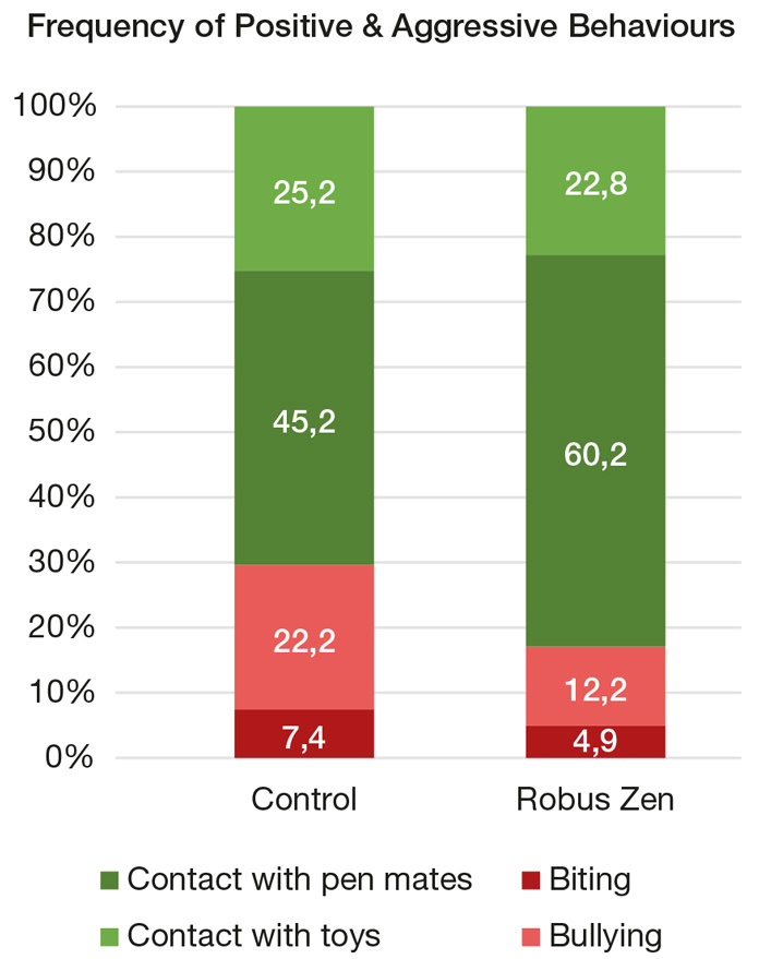 To mitigate aggressive behavior and improve profitability, Techna developed Robus Zen, a natural solution based on plant extracts and aromatic compounds. Robus Zen composition exerts calming effects by modulating neurotransmitters. It also supports digestive, antioxidant, and immune functions, thereby reducing the negative impact of aggressive behavior on performance. Field trials demonstrated that pigs receiving Robus Zen at 1 kg/t showed reduced physical activity throughout the finishing period and 42% fewer aggressive behaviors (such as tail and ear biting). Mortality and culling due to severe lesions or digestive disorders were also reduced.