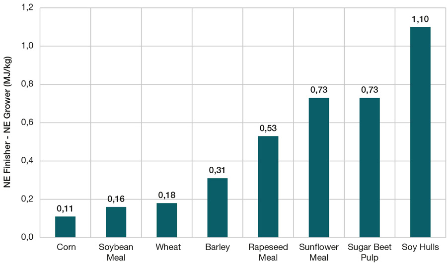 This equation is based on improved nutrient digestibility—particularly of fibers and amino acids—as pigs grow. Recent studies have demonstrated a 2.6% increase in energy digestibility between pigs weighing 35 kg and 75 kg, attributed to better utilization of fibers (NDF, hemicellulose, cellulose) and nitrogen. This allows for a more accurate description of the energy value of raw materials according to fiber content and pig weight. The difference between growth (7–75 kg) and finishing (75–130 kg) net energy values depend on the nutritional characteristics of raw materials—whether rich in starch or fat (corn, sorghum, soybean) compared with fiber-rich ingredients (sunflower meal, beet pulp, soybean hulls).