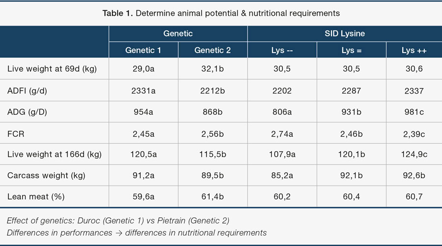 For instance, pigs from two genetic lines were fed three different lysine digestible levels (high, medium, low) ad libitum from 30 to 120 kg. Genetics had a major influence on performance, with differences of 86 g/day in average daily gain (ADG) and 0.15 points in feed conversion ratio (FCR), and different lysine-to-net energy ratios to achieve optimal efficiency depending on genotype. Consequently, these variations in performance potential imply strong variability in nutritional requirements, highlighting the need to adapt nutritional recommendations according to genetics.