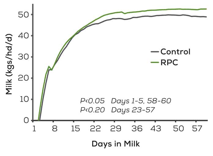 In 2020-2021, a trial was performed to evaluate RPC supplementation from 21 days prior to calving through 60 days in milk under commercial conditions. Overall performance was improved for cows receiving RPC with an 8.6% increase in energy-corrected milk (See figure 2 daily milk yield). Plus, increased blood glucose at 3 days post calving points to a potential change in insulin response and liver gluconeogenesis.