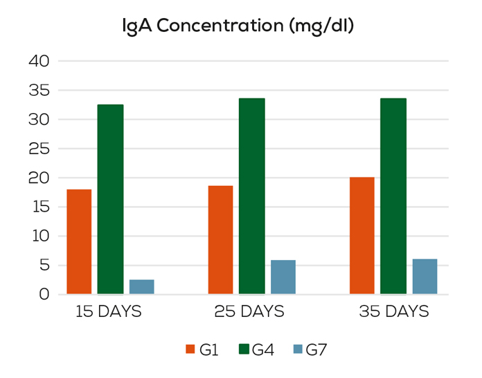 The studies conducted at the University of Baghdad by Thajel and Ulaiwi et al. [2,3] showed that a combination of natural EOs containing eucalyptus oil, mint oil and thyme oil plus L-menthol can have beneficial effects in broilers after vaccination against Infectious Bronchitis (IB) and Newcastle Disease (ND). According to the researchers, the administration of Aromax® from XVET Germany led to an improvement in the local and humoral immune response in broilers. A higher concentration of immunoglobulin A (IgA) was shown in a study monitoring the effect after ND vaccination (Graphic 1). IgA is essential for promoting local immunity in the respiratory and gastrointestinal tracts.