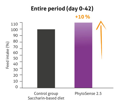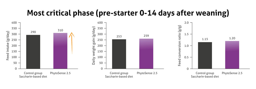 In the first 14 days post-weaning (pre-starter phase), piglets receiving PhytoSense 2.5 consumed 7% more feed than the control group, while maintaining similar ADG and FCR.