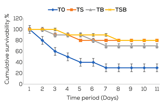 Another major benefit of betaine in aquaculture is its ability to reduce the negative impacts of stress. Betaine has been shown to reduce the levels of stress hormones in the body, which can help to improve the overall health and well-being of animals. Stress is known to lead to reduced growth, impaired immune function, and increased susceptibility to diseases. An example of decreased disease susceptibility can be seen in an experiment with Nile tilapia, where either spirulina (TS) at 0.3%, betaine (TB) at 0.5% and the combination of both (TSB) were compared with a control diet without these feed additives. After a challenge with Aeromonas hydrophilia, betaine significantly improved survival compared to the control diet and similar results with the spirulina-enriched diets (Figure 4).