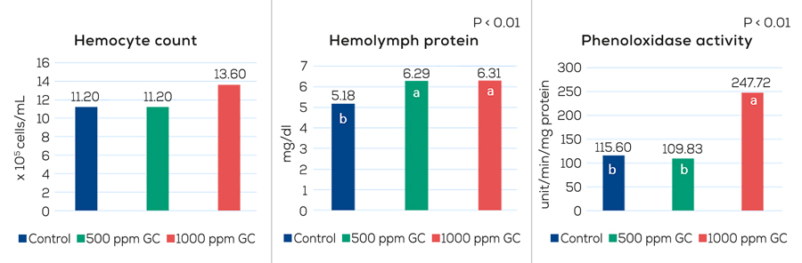 In shrimp, similar results have been observed. In a trial performed in Thailand, by Dr Orapint, shrimp were fed either 0, 0.5 or 1 kg/MT from the garlic-cinnamon blend (Excential Alliin Plus, Orffa Additives BV). Addition of the phytogenic feed additive led to increased growth performance and feed efficiency, regardless of the source. But next to that, the inclusion of the garlic-cinnamon blend in the diet led to overall higher disease resistance. The same shrimp were challenged with Vibrio parahaemolyticus, after which immune parameters were measured. In general, hemocyte count, hemolymph protein and phenoloxidase activity were all elevated by the garlic-cinnamon blend (Figure 2). These parameters are indicators of the innate immune response and antioxidant capacity, which aid the shrimp in a swift and effective response against pathogens. Besides these parameters, lysozyme activity was significantly improved when the garlic-cinnamon blend was added at 1 kg/MT.