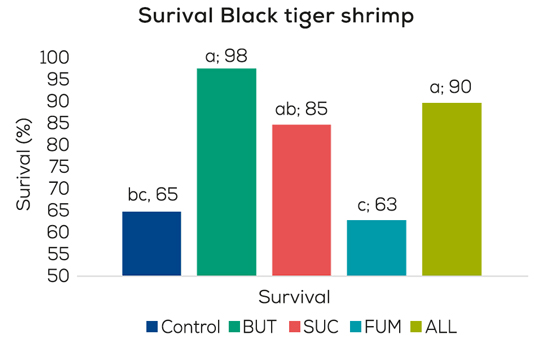 In addition to its effects on gut health, butyrate has also been shown to improve immune functioning of animals. This can help to protect the animals from diseases and infections and can improve overall survival rate. Butyrate has also been found to have anti-inflammatory effects, helping to reduce the damage caused by infections and other stressors. An example of increased survival rate after addition of butyrate to the diet can be seen in a trial with black tiger shrimp. This trial compared the efficacy of different organic acids in 5 diets; a control without any organic acid added, BUT with 10 g/kg butyrate addition, SUC with 10 g/kg succinate addition, FUM with 10 g/kg fumarate addition and ALL with all three organic acids at 10 g/kg each (total organic acids addition of 30 g/kg of feed). After a feeding trial of 42 days, it could be observed that the overall survival was significantly highest in the shrimp fed butyrate (Figure 3).