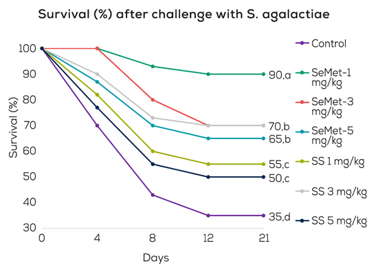 During a feeding trial of 8 weeks, Nile tilapia were either fed a control diet, without added selenium, or a diet with 1, 3 or 5 mg/kg selenium from sodium selenite, or a diet with 1, 3 or 5 mg/kg selenium from L-selenomethionine (Excential Selenium 4000, Orffa Additives BV). After 8 weeks of feeding the seven different diets, it was observed that addition of selenium as L-selenomethionine significantly improved the growth performance and feed efficiency compared to the control treatment, with an optimum dosage at 1 mg/kg selenium addition. At the same time, selenium from sodium selenite did not improve growth performance and feed efficiency compared to the control treatment. After 8 weeks the same fish were challenged with Streptococcus agalactiae. For 21 days the cumulative survival was measured and compared among all treatments. What could be observed was that, regardless of the source, selenium allowed for an increase of the cumulative survival in Nile tilapia. However, when looking at figure 1, it can be observed that L-selenomethionine (SeMet) supplementation led to significantly increased survival compared to sodium selenite (SS).