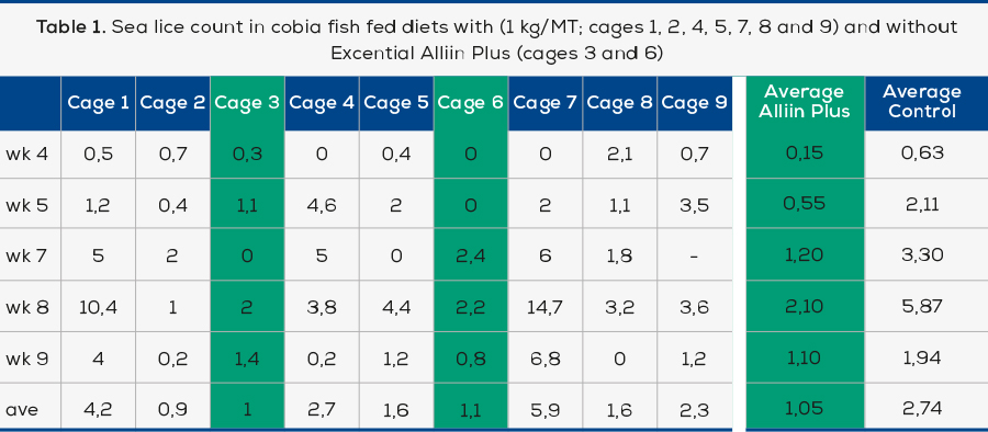In aquaculture, the use of garlic and cinnamon to support fish in their defense against pathogens is widely accepted. For example in cobia fish, it is observed that the inclusion of 1 kg/MT of a garlic and cinnamon product, in the form of Excential Alliin Plus (Orffa Additives BV), has led to a significant decrease in the occurrence of sea lice on the fish by 60% (Table 1).