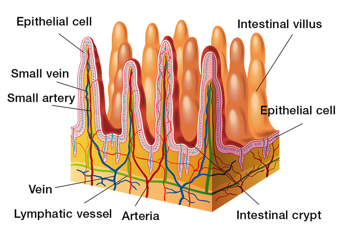 The small intestine is not as widely discussed in dairy cows, however it has a role to play in the digestive process. The small intestine consists of three sections: The duodenum, jejunum and ileum. The small intestine completes most of the digestive process and absorbs many nutrients through villi (small finger-like projections). From the villi the nutrients enter into the blood and lymphatic systems.