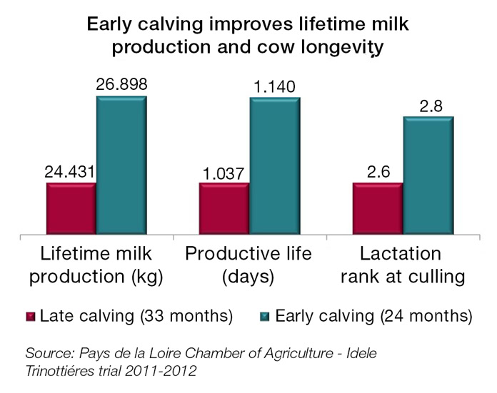 ● A good preparation for breeding will improve the efficiency of the feed diet and thus positively improve the reproduction, health, production of the herd, and age at first calving (Figure 3). A calving age between 22-25 months can lead to higher lifetime milk production, improved reproductive health, and reduced rearing costs,