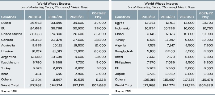 The USDA’s May report, on the other hand, paints a slightly different picture from the IGC report in terms of trade. According to the USDA data, the world wheat trade, which was around 178 million tons in the 2018/19 season, amounted to approximately 195 million tons in the 2019/20 season and 197 million tons in the 2020/21 season. In the 2021/22 projection, the USDA predicts that the amount of wheat that will be subject to world trade will be around 203 million tons.