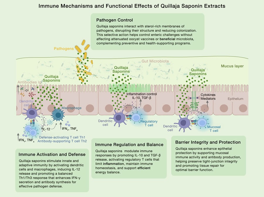 • Quillaja Extracts: Powder and liquid forms standardized in triterpenic saponins. Their defined composition provides predictable immune modulation and health support while helping control pathogen-related challenges, making them valuable during periods of increased biological pressure or vaccination programs.