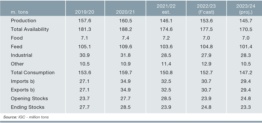 Forecasts for the 2023/24 season point to a decrease in both production and consumption. However, the expectation of a decrease in production (7.9 million tons) is much higher than the expectation of a decrease in consumption (5.5 million tons). This is reflected in the reports as a projection of 147.2 million tons of consumption against 145.7 million tons of production in the current season. According to these projections, the decrease in year-end stocks in the 2023/24 season will be limited to 1.5 million tons. The USDA data also supports the IGC data with 2-3 million tons differences.