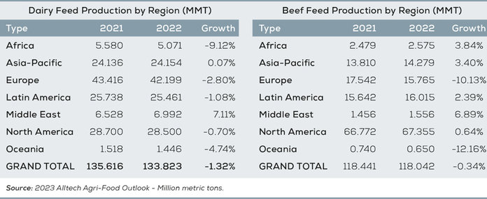 Latin America ranks third in world dairy feed production with 25.5 million tons. According to the Alltech report, Peru reported a double-digit feed production decrease in 2022 due to reduced commercial dairy population in the region. Brazil’s dairy feed production dropped in 2022 because of unfavorable weather that resulted in poorer pasture conditions, as well as lower consumer demand, economic challenges, low consumer disposable income and rising milk retail prices.
