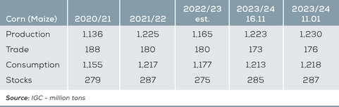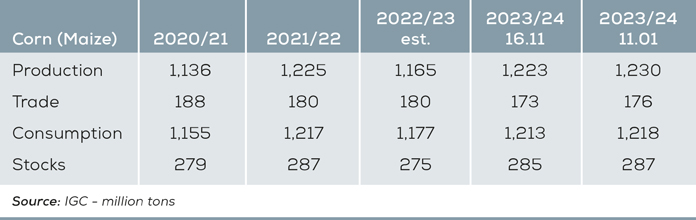 According to the IGC report, world corn trade, which was 188 million tonnes in the 2020/21 season, declined to 180 million tonnes in the next two seasons (2021/22 and 2022/23). IGC forecasts that world corn trade will continue to decline in the 2023/24 season and remain around 176 million tonnes. USDA’s January report, on the contrary to IGC, draws an increasing picture and predicts that trade will reach 198 million tonnes in the 2023/24 season, up from 180 million tonnes in the 2022/23 season.