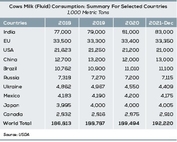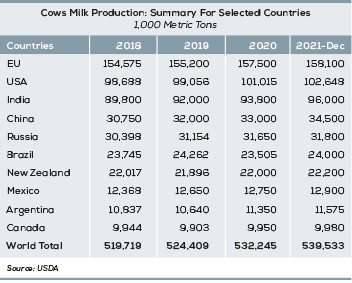 The total milk production of the EU (157 million tons), the US (101 million tons), New Zealand (22 million tons), Argentina (11 million tons), and Australia (9 million tons) was estimated to be 301 million tons in 2020, according to same report. This amount is expected to reach 304 million tons in 2021.