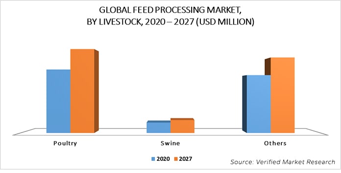 On the basis of livestock, the global feed processing market has been segmented into poultry, swine, and others. According to the report of Verified Market Research; the poultry segment accounted for the largest market share in 2019. The poultry meat is one of the highest among others such as pork, beef, and fish meat. Hence, a major opportunity lies in the poultry feed segment. Manufacturers are making significant investments in developing innovative feed equipment technologies for the production of various forms of high-quality poultry feed. The process of poultry feed production is generally categorized into the steps such as feed raw materials receiving and cleaning, raw materials crushing, batching, mixing, pelleting, and packaging of finished feed products.