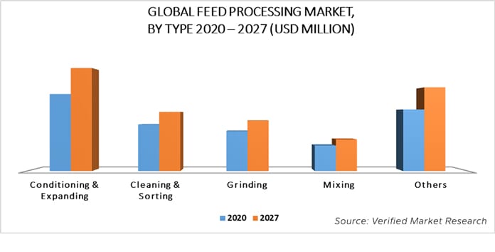 On the basis of type, feed processing market has been segmented into conditioning & expanding, cleaning & sorting, grinding, mixing, and others. The report of Verified Market Research explains that the conditioning & expanding accounted for the largest market share in 2019. According to the report; many animal species have a poor capacity to digest starch, but they can digest ripe starch to a great degree. Under the operation of hydrothermal via conditioner, the level of gelatinization of starch increases dramatically. At the same time, it facilitates the thermal denaturation of protein in the product. Conditioning foodstuffs at a certain temperature level can kill bacteria such as Salmonella and ensures feed hygiene quality. Low cost, pollution-free, no drug residue, and side effects compared with drug-disease prevention are some of the benefits that have boosted the adoption of conditioning & expanding machinery.