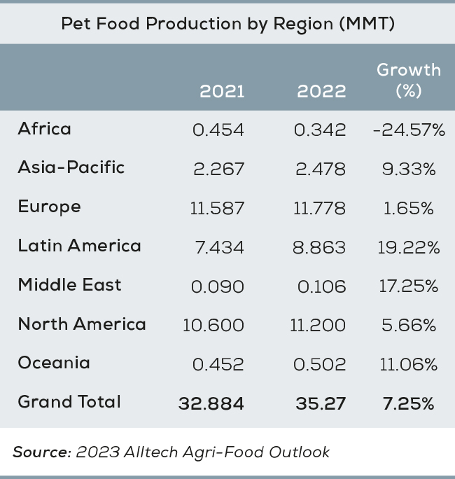 Although Asia-Pacific is the world’s largest producer of many types of feed, it lags behind in pet food production. Based on data compiled by Alltech, pet food production of the region, which was 2.27 million tons in 2021, increased by 1.65% in 2022 and amounted to 2.48 million tons.