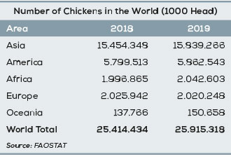 According to data from the United Nations Food and Agriculture Organization (FAO), the total poultry presence in the world (chicken, duck, goose, guineafowl, and turkey) is about 27.9 billion heads in 2019. The largest share of this presence belongs to by chickens, with about 93 percent. The number of chickens worldwide has more than doubled since 1990, according to the FAO. The number of chickens, which was 14.38 billion in 2000, reached 25.9 billion in 2019. The largest share of this presence belongs to Asian countries. In the same period, the total chicken presence in Asia was 15.8 billion. It is followed by the Americas with 5.8 billion. The chicken presence in Africa and Europe is about 2 billion each.