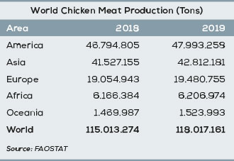 Looking at the data specific to chicken meat, it is seen that the production of chicken meat, which was 115 million tons in 2018, reached 118 million tons in 2019. The largest share in chicken meat production belongs to the countries of the Americas with a production amount of 47.9 million tons in 2019. In the same year, America is followed by Asia with 42.8 million tons, Europe with 19.4 million tons, and Africa with 6.2 million tons.