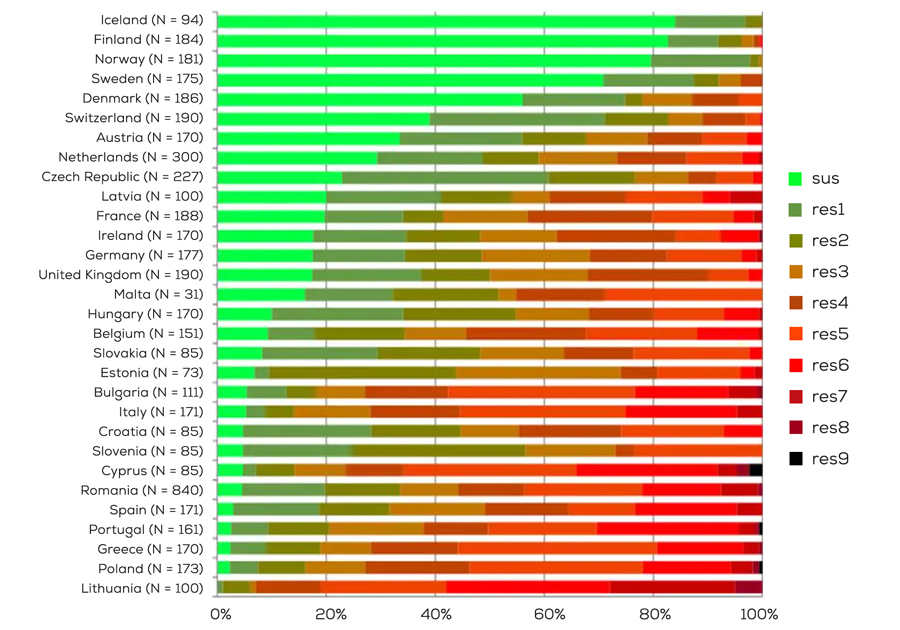 The surveillance of AMR not only demonstrates the impressive success of animal producers to reduce antimicrobial consumption but also demonstrates the possibilities for further improvements. As shown in Figure 3, the prevalence of antibiotic-susceptible bacteria (those not resistant to antibiotics) can be as high as 80%, which is the current situation in Iceland, Finland, and Norway. It will be very challenging or perhaps even impossible to achieve the antibiotic resistance prevalence of the pre-antibiotic era. However, a big reduction is surely possible for animal producers in many countries. Ensuring the efficacy of antimicrobials in the future and reducing AMR is possible and provides clear benefits for the health of animals and people.