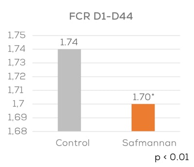 2Sims, D.M., et al., USA, 2017. Perfomance of Broilers Fed Diets with BMD or Safmannan® in the Presence of a Moderate Clostridium perfringens Challenge in a 42-Day Floor Pen Trial. Internal Report.