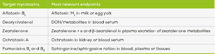 Table 1 illustrates the most relevant biomarker endpoints for substances reducing the contamination of feed by mycotoxins as stated in the EFSA journal guidelines on efficacy.8