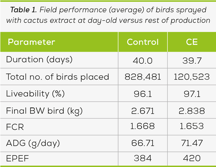 To explore the potential performance benefits of CE in broilers, trials were undertaken in Brazil over consecutive months on several different farms. Poultry houses were naturally ventilated, bedding comprised wood shavings and birds fed a corn-soy ration with a nicarbazin/salinomycin anticoccidial shuttle. Over 3 trial periods, birds given CE at day-old via spray were compared to the production average (Control). CE was administered in addition to the standard programme and no other changes made (neither feed nor management were changed to implement cost savings, for example). Different farms were selected each time for CE application. Across all trials, birds administered CE at day-old via spray were on average 6.3% heavier, had a 1% lower mortality and FCR with an associated 9% improvement in EPEF (Table 1).