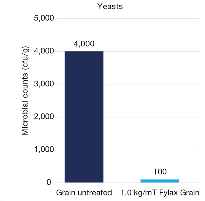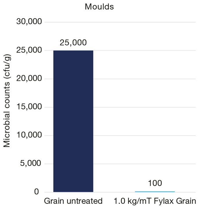 The effectiveness of Fylax Grain has been validated in both laboratory and field settings. Figure 1 illustrates its influence on the germination of spores and mycelial growth of the mycotoxin-producing mould Aspergillus chevalieri. Moreover, the application of Fylax Grain to stored barley successfully lowered mould and yeast populations to below detectable levels, as demonstrated in Figures 2 and 3.