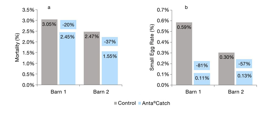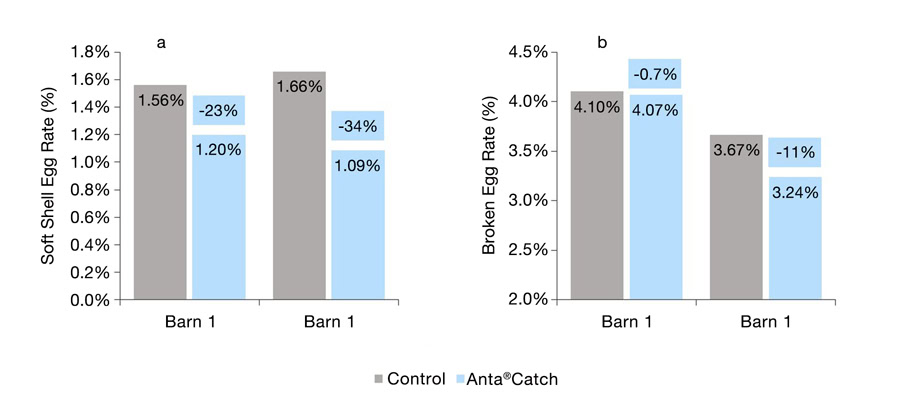 During the control phase (barn 1: 32–39 weeks; barn 2: 34–42 weeks), hens received a standard diet. In the subsequent treatment phase (barn 1: 39–45 weeks; barn 2: 42–47 weeks), the same diet was supplemented with Anta®Catch at 1 kg per tonne of feed. Environmental and management factors remained comparable.