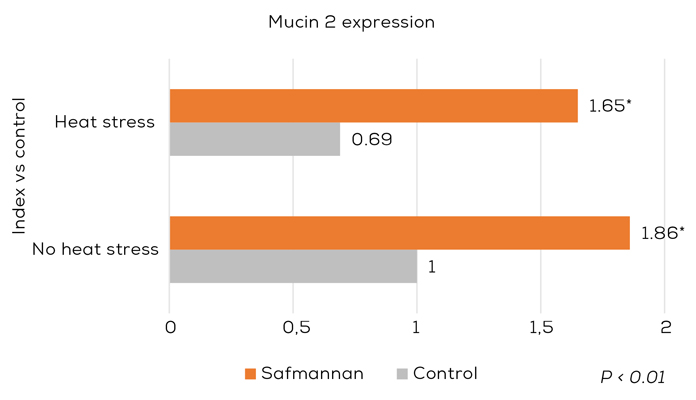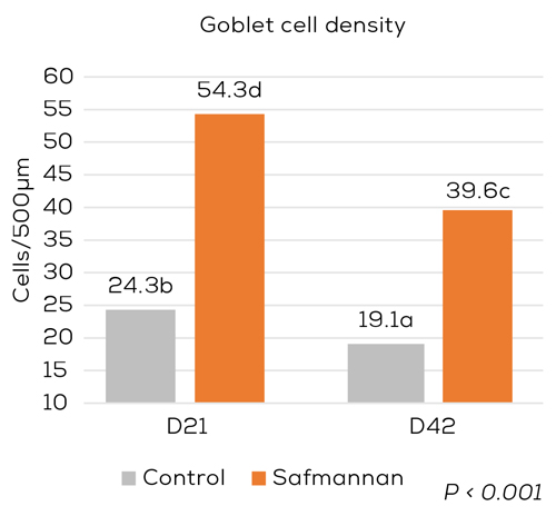 An essential function of the intestinal mucosa is to act as a physical barrier between gut luminal content and the remainder of the body. The physical intestinal barrier depends on a variety of mucosal structural components that confer the property of selective permeability with free exchange of water, ions and macromolecules between the intestinal lumen and the underlying tissues. The luminal surface of the intestinal mucosa is lined by a hydrated gel, composed of mucins secreted by goblet cells. This layer prevents large particles and intact bacteria from coming into direct contact with the underlying epithelium. Underneath the mucus layer, there is the epithelial monolayer as primary determinant of the mucosal barrier. An intact epithelium restricts the passage of hydrophilic solutes but to further limit transmucosal flux, the paracellular space needs to be sealed as well. This task is regulated by a series of intracellular junctions (tight junction, adherens junctions and desmosome) who together form the apical junctional complex (Odenwald and Turner 2017). An experiment performed in 2020 by Pascual et al., showed that supplementation of the yeast postbiotic Safmannan® containing >20% mannans and >20% β-glucans could increase the goblet cell density (Figure 1).