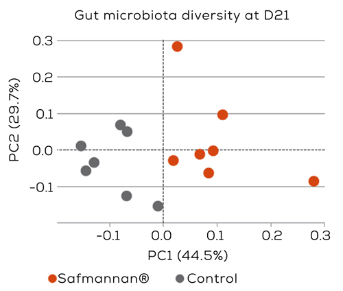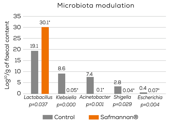 In cells, the microbial inhabitants of the intestine largely exceed those of the host and mediate key physiological processes for the health of the host. The microbiota exhibits important functions in digestion, development and regulation of the gut associated lymphoid tissue (GALT) but also competes with pathogenic invaders. At the Phylum level, over 90% of the phylogenetic categories in the cecum either belong to the Phylum Firmicutes (Clostridium, Enterococcus, Lactobacillus and Ruminococcus genera) or to the phylum Bacteriodetes (Bacteroides and Prevotelle genera), while at the species level there are huge differences in microbiota composition. Nevertheless, one constant characteristic of a healthy microbiota is that has a high diversity. Moreover, within the same host, the composition of the microbiota is influenced by a variety of factors. In some cases, this can even lead to dysbiosis, an undesirable alternation of the microbiota resulting in an imbalance between protective and harmful bacteria populations. Dysbiosis was practically unknown until the ban of AGPs, but since then one of the most challenging problems in broilers (Ducatelle et al., 2015). Dysbiosis can also be caused by the diet and especially in times when good quality raw materials are expensive and are not always available; this can be a problem. Nevertheless, a study performed in Brazil showed that the yeast postbiotic Safmannan® was able to increase the microbiota diversity of broilers receiving a low-quality diet. Significant increases in beneficial genera such as, Roseburia, Ruminococcus torques, Eubacterium hallii and Shuttleworthia were observed while Enterobacteria numbers decreased (Figure 5).