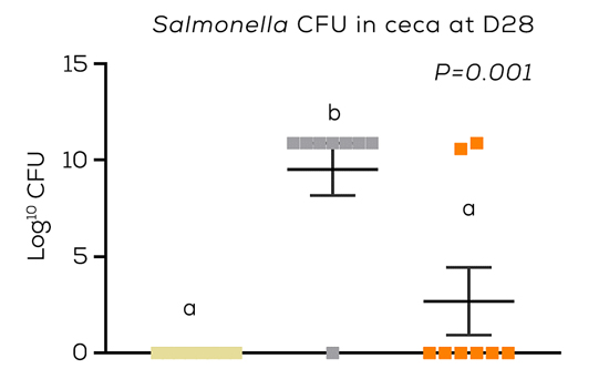 This is confirmed in a Salmonella Typhimurium challenge model where administration of Safmannan® reduced the Salmonella colonization in ceca (P=0.001) on D28 of the trial. A reduced colonization of Salmonella in the liver (P=0.038) also indicates that an increased intestinal health reduced the translocation of the pathogen to systemic organs (data on file) (Figure 7).