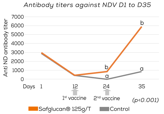 Thanks to the potential of β-glucans to increase antibody titers, yeast β-glucans Safglucan® is also very efficacious vaccine potentiator. This is demonstrated in several vaccination trials, were the administration of Safglucan® led to the increase in titers against Newcastle Disease (ND). Safglucan® increased anti-ND specific antibodies in serum when supplemented through the diet (Figure 8).
