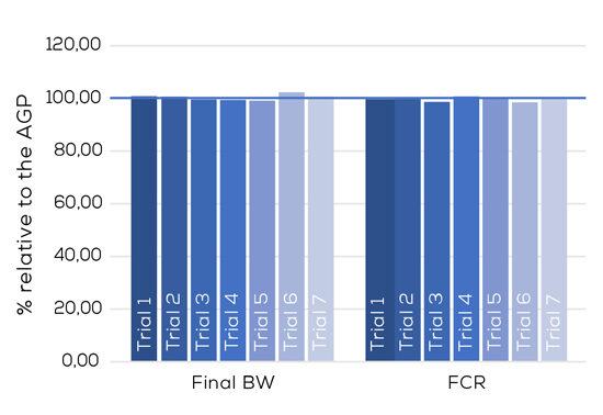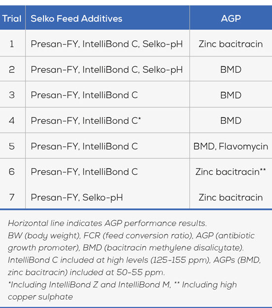 Each study compared an AGP group (BMD or zinc bacitracin) with a combination of Selko products (Presan-FY, IntelliBond C, Selko-pH). Results revealed that the performance for birds receiving the Selko additives was equal to the performance of birds receiving AGPs (Figure 2).