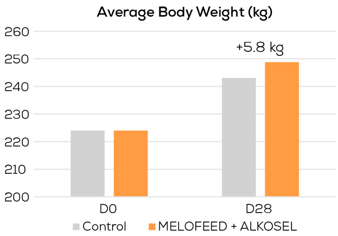 – Alleviate weight gain losses: + 5.8 Kg of gain after 28 days of supplementation (Figure 1).