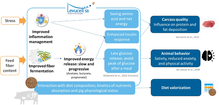 In the study by Serviento et al 2022*, it was also been demonstrated that LEVUCELL SB has a positive effect on insulin sensitivity. Insulin is a key hormone in glucose metabolism; this study provides more insights into the possible involvement of the live yeast in glycemia management. This, along with reduced inflammation, may benefit pig carcass quality and behavior (Figure 1). Ongoing research aims to further explore LEVUCELL SB’s role in improving pig metabolic functions.