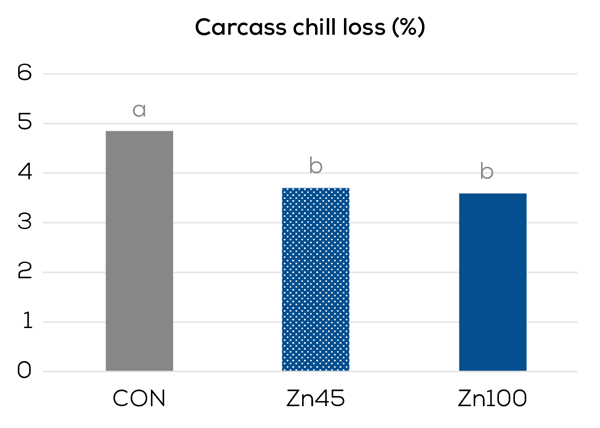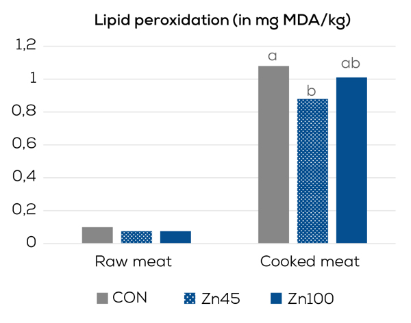 Zinc is an essential nutrient for many physiological processes in the organism supporting health and good growth and development. Major functions of zinc on a cellular level are catching free radicals and preventing lipid peroxidation as part of the antioxidant system (5). Therefore, a deficiency of zinc in pigs may affect the pork quality after slaughter and processing.