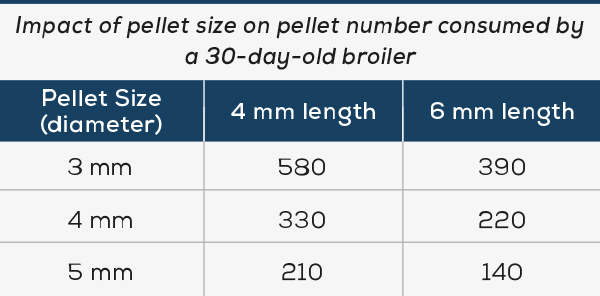 When given a choice in particle sizes, birds invariably show a preference for the largest particles. This situation becomes obvious when ‘fines’ accumulate in the feeder pans over time. As shown below, as pellet size increases, so does the bird’s need to consume fewer pellets. As a result, they need to spend less time at the feeder. Naturally, this idealised pellet size must be balanced against the willingness of mill managers to accommodate the necessary changes in pellet die size. Matching pellet size to bird age becomes critical as stocking density increases.