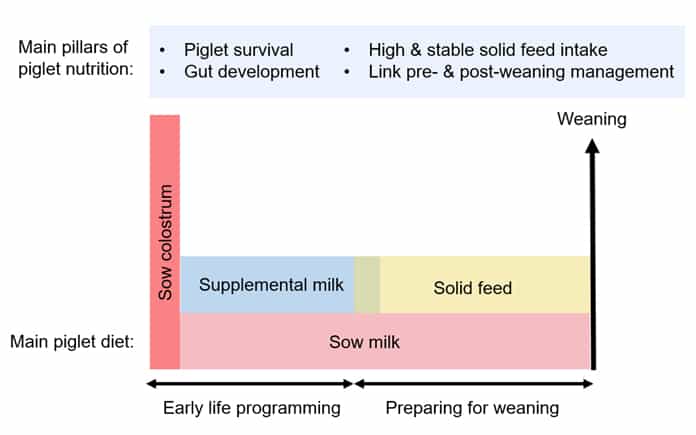 These challenges that pig producers encounter require an integrative nutritional approach that combines interventions during the pre- and post-weaning period. Various studies have shown that early life programming of the GIT already during the suckling period can have long-term effects. One of those is that piglets pre-weaning microbial composition can predispose piglets to post-weaning diarrhoea as shown by French and Czech Republic studies (Dou et al, 2017; Karasova et al., 2021). In the following paragraphs we will summarize some of the early nutritional interventions that can be utilised to shape piglets’ gut for successful weaning.