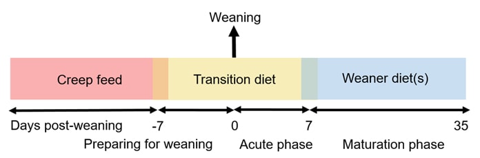 The use of a transition diet around weaning is a good strategy to achieve a perfect match between the pre- and post-weaning diet (Figure 2). To provide GIT with sufficient time to adapt in terms of structure and function to the transition diet, it is recommended to start feeding this diet about one week before weaning. After weaning, the transition diet should not be replaced too soon. In the first days after weaning, also called ‘the acute phase’, the feed intake of the piglets is recovering and the gut is in dysbiosis as result of the large dietary change, in combination with the other stressors at weaning. It is therefore recommended to continue the transition diet up to one week after weaning.