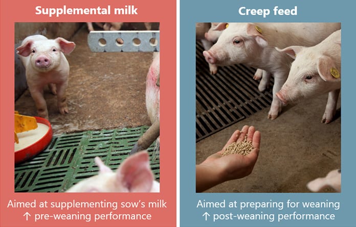 While both supplemental milk as well as creep feed can serve as early life gut modulators, there are also notable differences why to use one or the other in relation to piglet performance (Figure 1). Supplemental milk is aimed at supplementing sows’ milk and therefore to improve pre-weaning performance. However, creep feed is aimed to prepare the piglets for weaning and therefore to improve post-weaning performance and often has only marginal effects on pre-weaning production. Piglets have the ability to suckle and drink from birth, however to eat solid feed they need to develop their teeth, oral motor skills, and mastication muscles. Creep feed thereby prepares piglets behaviourally, by getting piglets familiar with solid feed. On the other hand, creep feed also prepares piglets physiologically, by learning them how to digest and ferment the feed ingredients that are not in sows’ milk and that they will encounter post-weaning.
