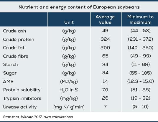 The nutrient composition of soybeans may vary considerably. Depending on the climate zone of the growing region and the variety used, the protein content, protein solubility, energy content and the content of anti-nutritive substances vary. These factors require a nutrient analysis of each batch of soybeans.