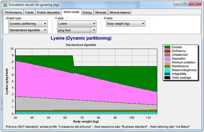 Inra Porc provides an estimation of the amino acid (AA) requirements for an individual animal, which is lower than the requirement of a population with the same average performance. Inra Porc also provides an indication of the requirement for a population of pigs, which is approximately 10% higher than the requirement of an average pig.